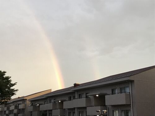 だいたいが朝から雨のイヤな天気だったのだ.買い物に行くなら雨が止んでからにしたいけど、どうなんだろう、と窓を開けたら大きな虹がかかっていた.まだ雨は完全に止んではいなかったが、家を出て近くの広場まで行った.こんな太い虹は記憶にない.二重の…