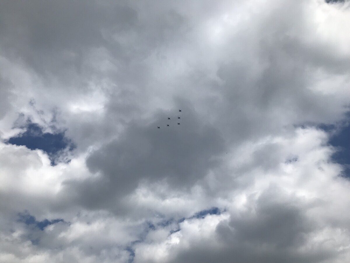 14時10分に入間基地を飛び立つ、と案内にはあった.14時ごろに家を出る支度をし、近くの見晴らしの良い公園に着いたのが14時10分ごろ.川崎まで来るのにどのくらいかかるかわからないが、周囲の景色などを眺めながらぼんやりしていたら、爆音が響き始めた。え、と思い反対側の空を見上げると、6機が編隊を組んで飛んでくるのが見えた.時計を見ると14時12分.まさかこんなに早く来るとは! あわててiPhoneを取り出し、カメラを起動して構えた時には飛び去って行くところだった.
